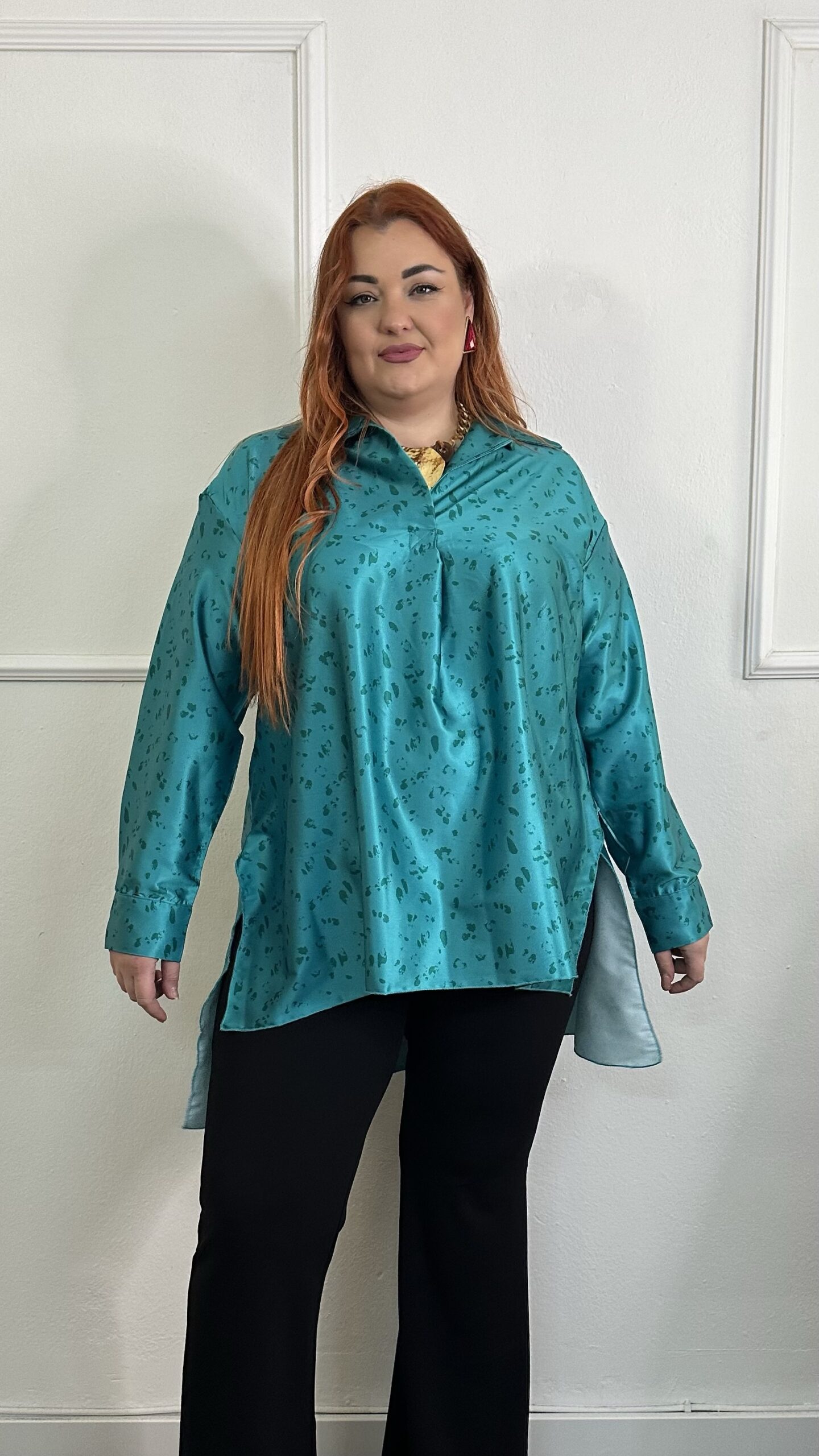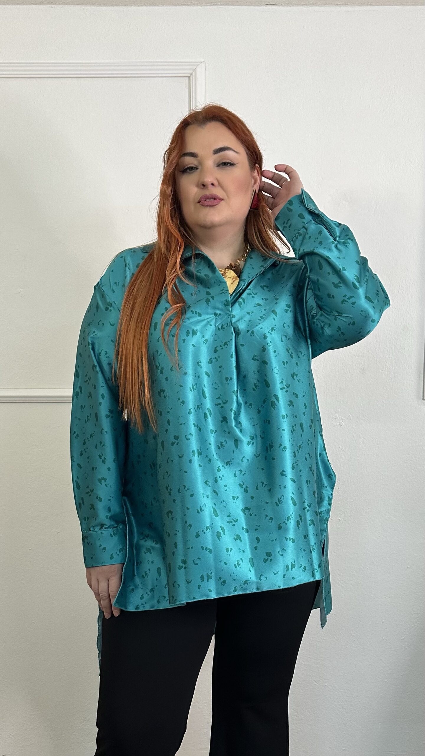 Σατέν μπλούζα με γιακά και άνετη γραμμή, ιδανική για κομψές και σύγχρονες εμφανίσεις. Διαθέτει απαλή υφή με διακριτική γυαλάδα, που χαρίζει πολυτελή αίσθηση και άψογη εφαρμογή. Ο χαλαρός γιακάς και το μακρύ μήκος προσφέρουν άνεση και στυλ, ενώ η άνετη γραμμή κολακεύει τη σιλουέτα χωρίς να περιορίζει την κίνηση.