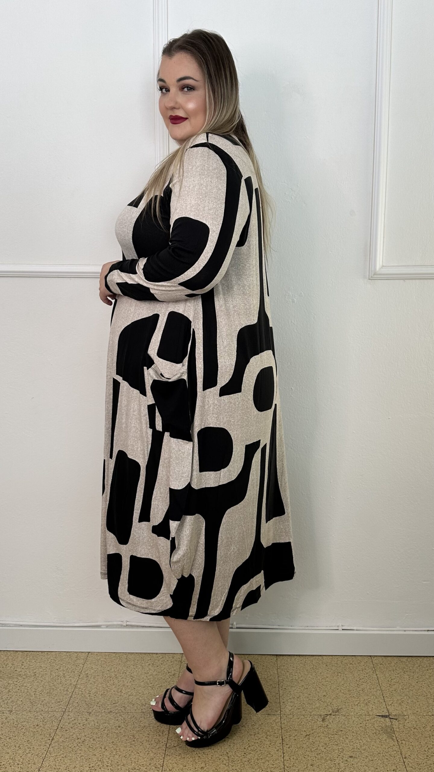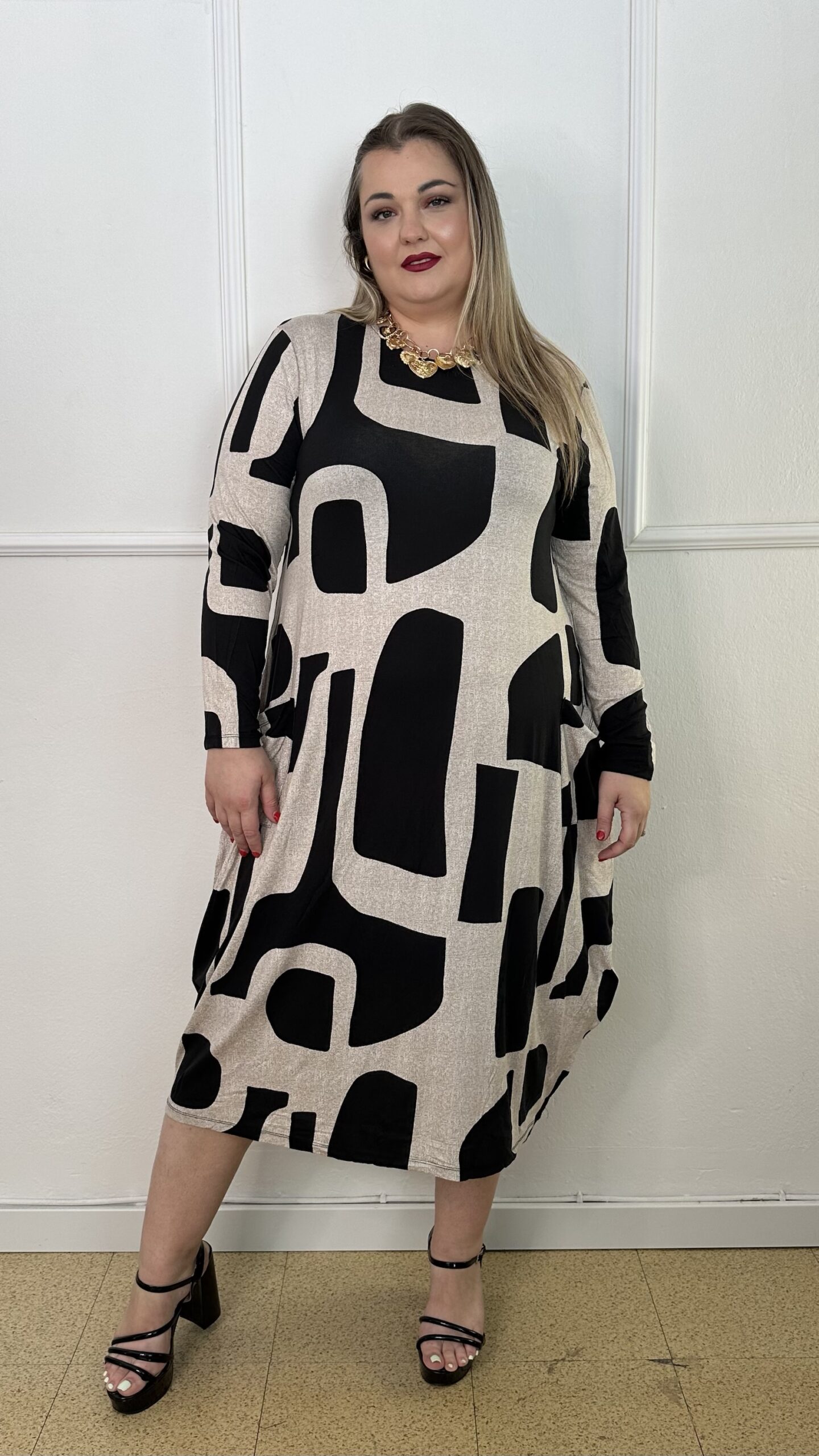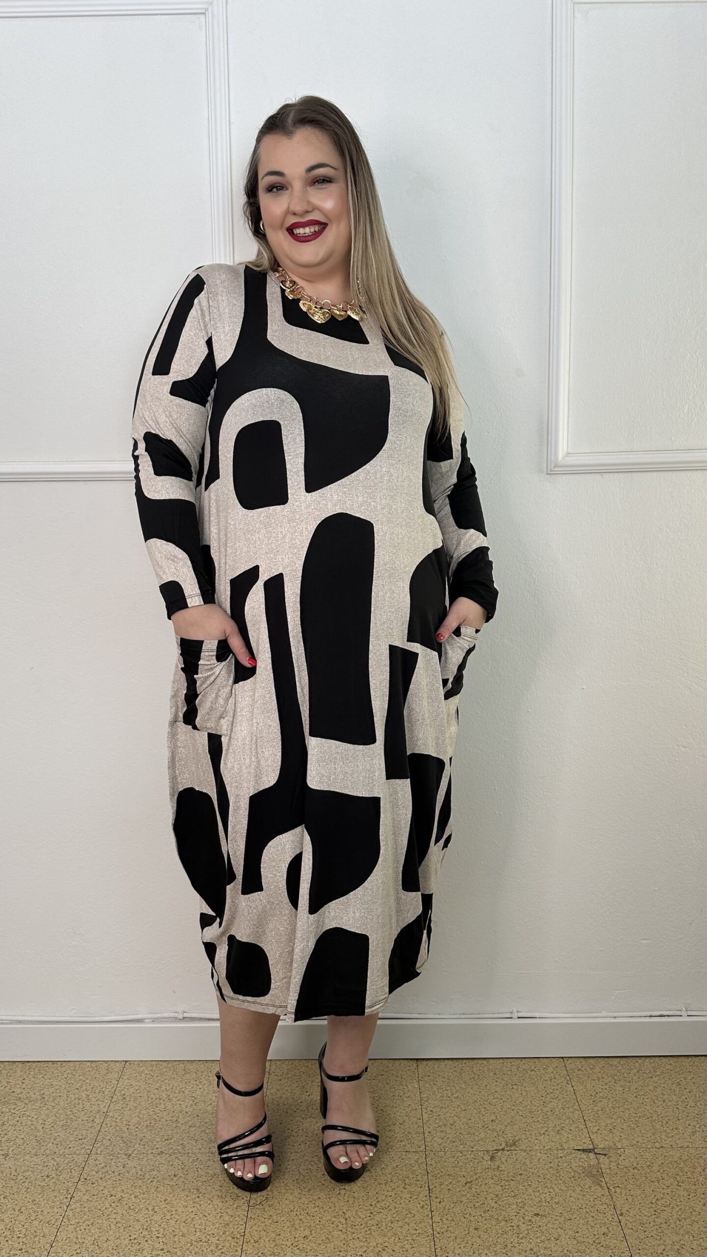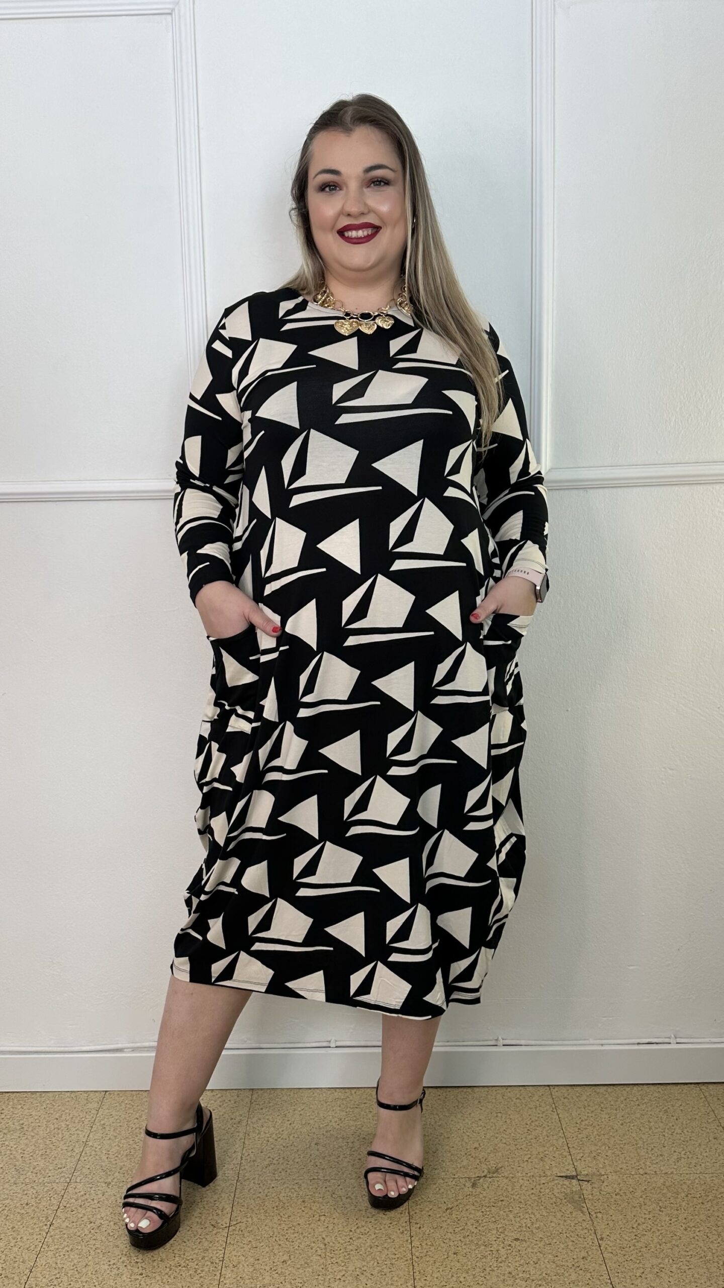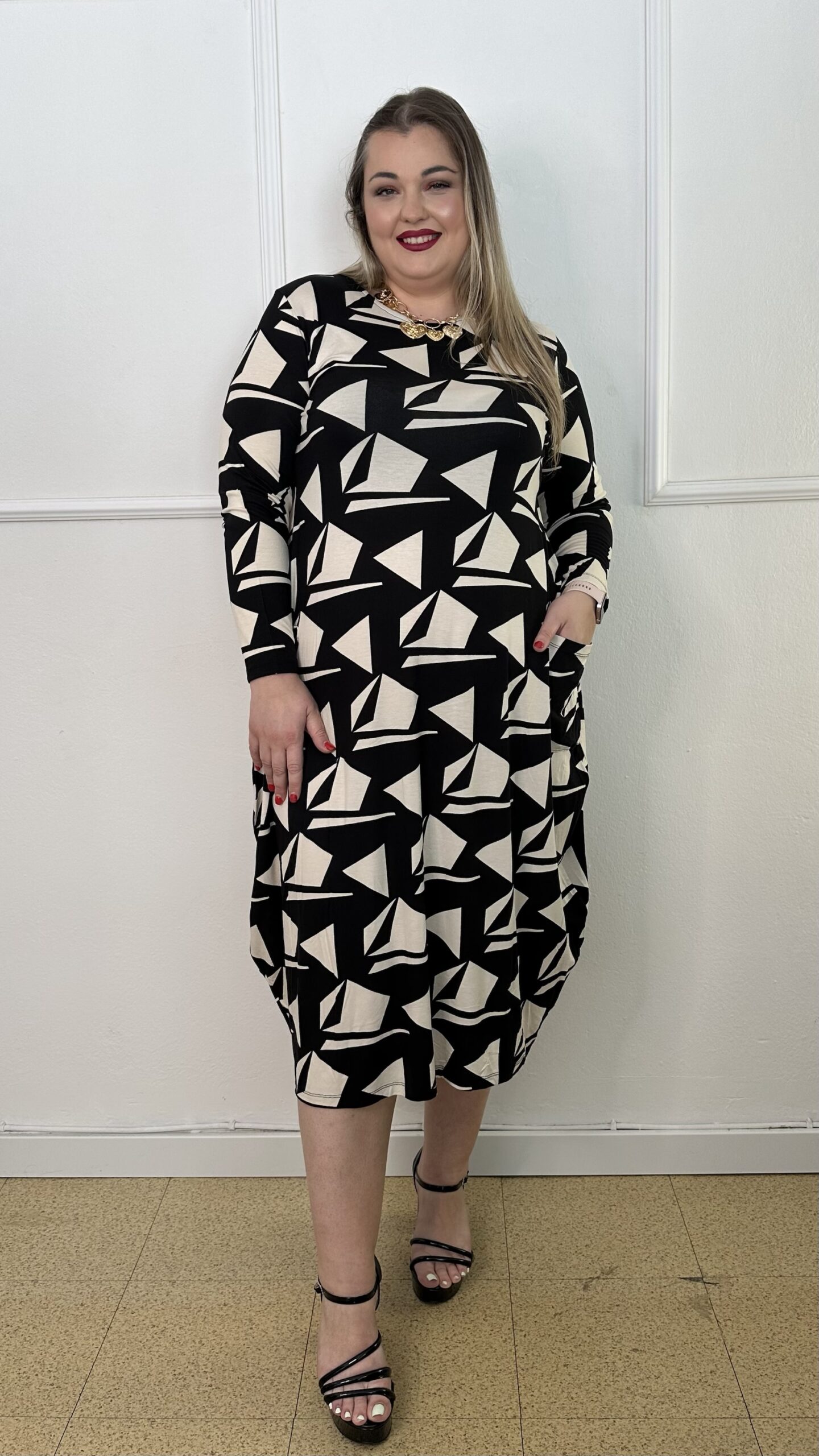 Φόρεμα από ελαστική βισκόζ, άνετο και ευκολοφόρετο, σε γραμμή τύπου σάκου που χαρίζει αίσθηση ελευθερίας στις κινήσεις. Το σχέδιο συνδυάζει δύο ντεσέν σε μοντέρνο γεωμετρικό μοτίβο, προσφέροντας κομψότητα και ξεχωριστό στυλ. Διαθέτει μακριά μανίκια και τσέπες στο πλάι για πρακτικότητα, ενώ το μήκος του φτάνει κάτω από το γόνατο. Ιδανικό για καθημερινές αλλά και πιο ιδιαίτερες εμφανίσεις, συνδυάζεται εύκολα με ψηλοτάκουνα ή φλατ παπούτσια.