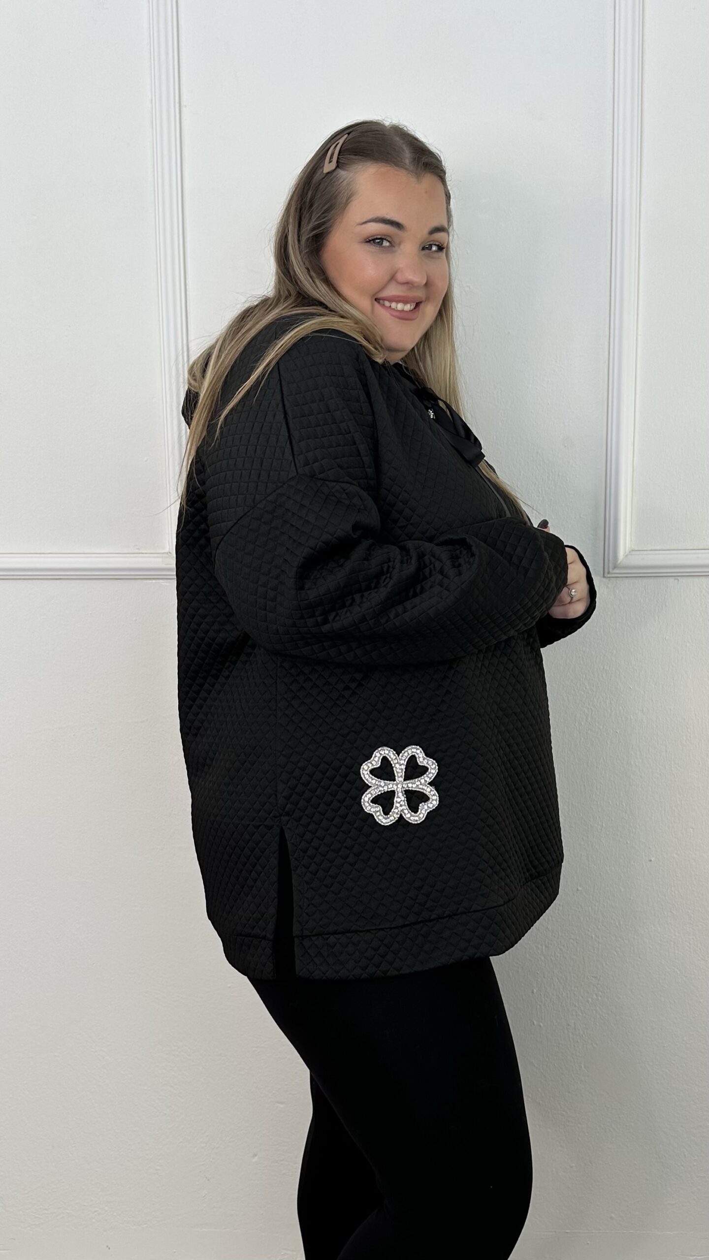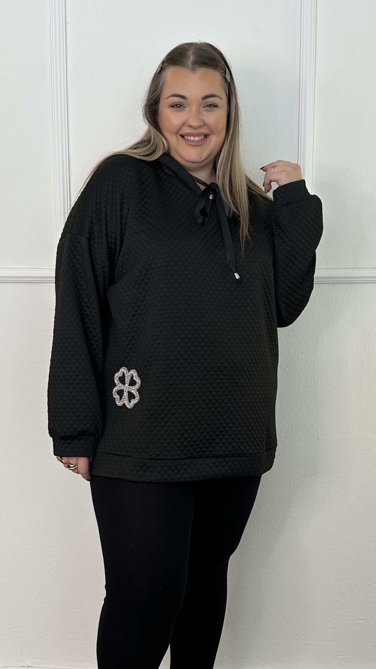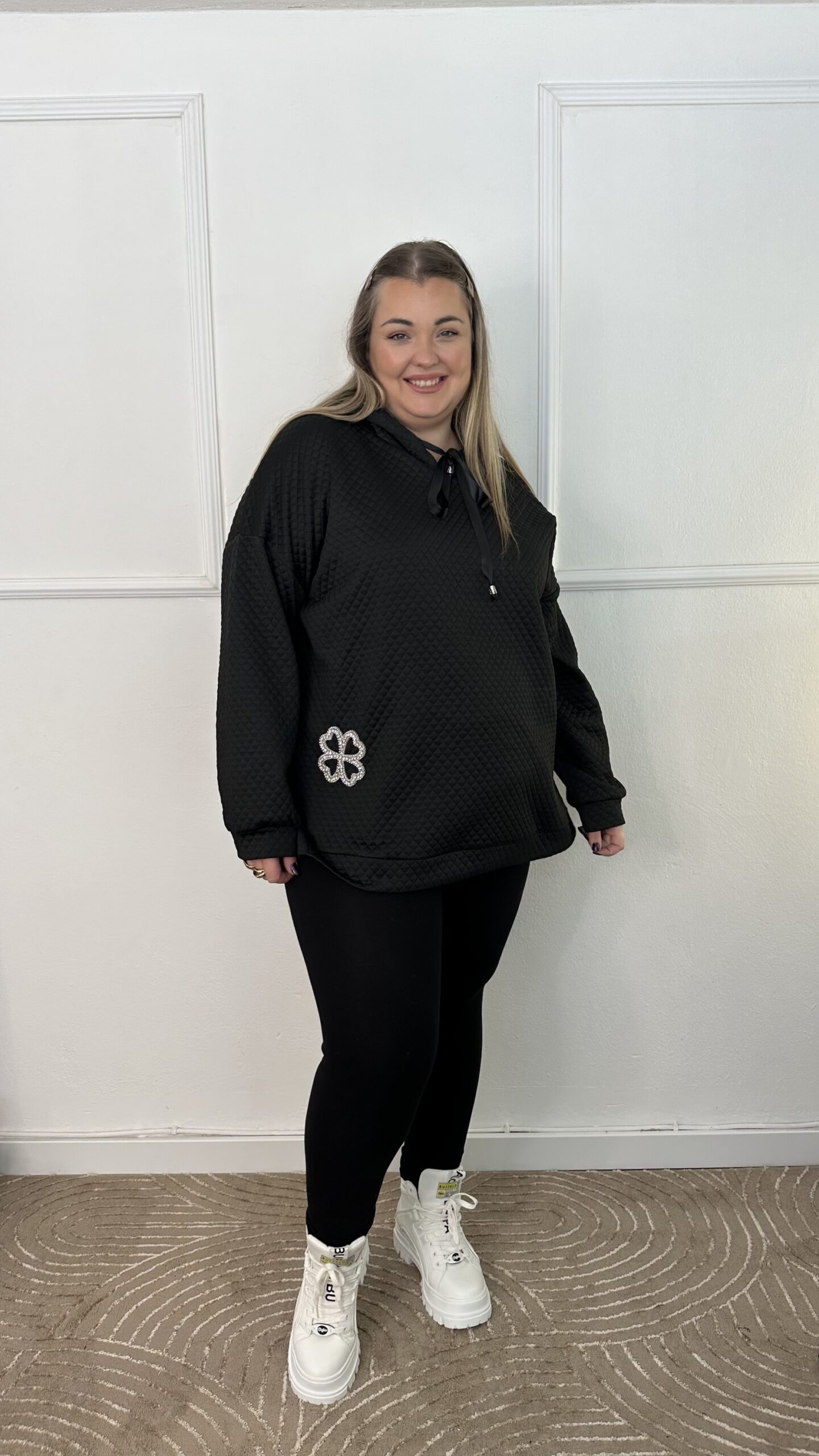 Διαθέτει κουκούλα με σατέν κορδόνι για μια πιο μοντέρνα και θηλυκή πινελιά, ενώ το διακοσμημένο λουλούδι με στρας χαμηλά στο πλάι προσθέτει διακριτή λάμψη και φινέτσα. Ένα κομμάτι ιδανικό για casual αλλά και πιο προσεγμένες εμφανίσεις, συνδυάζοντας άνεση και κομψότητα.