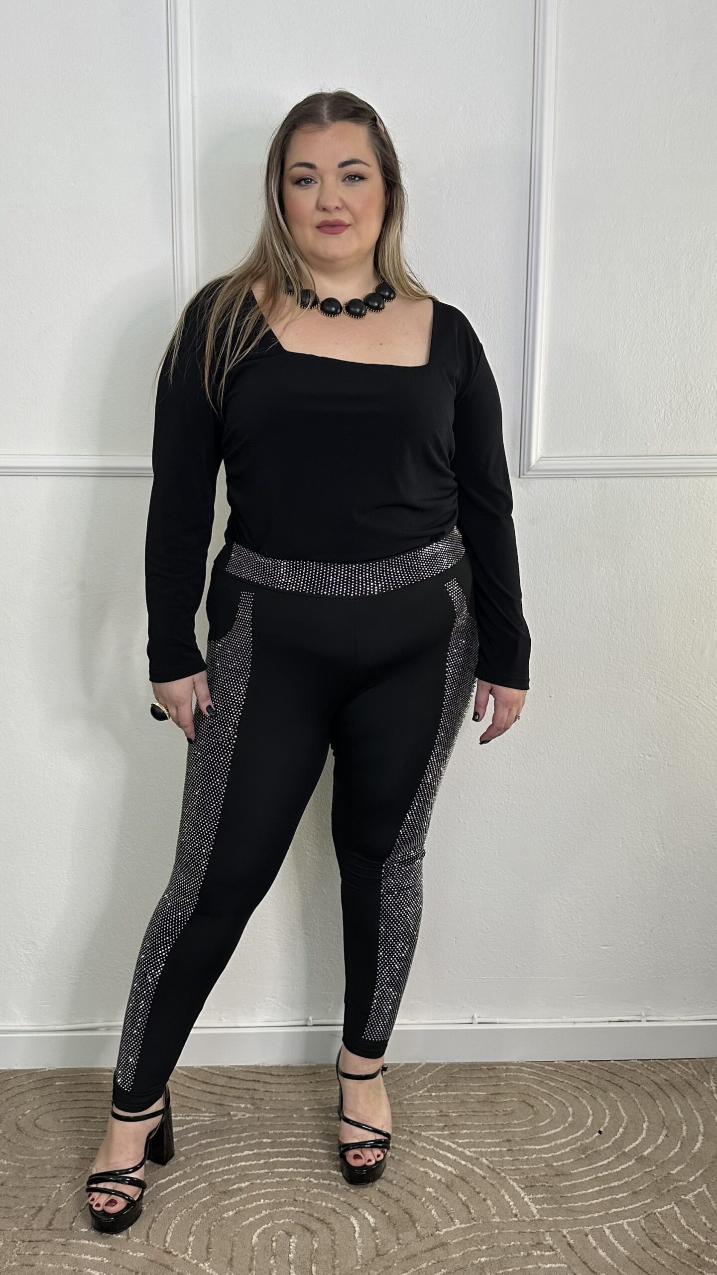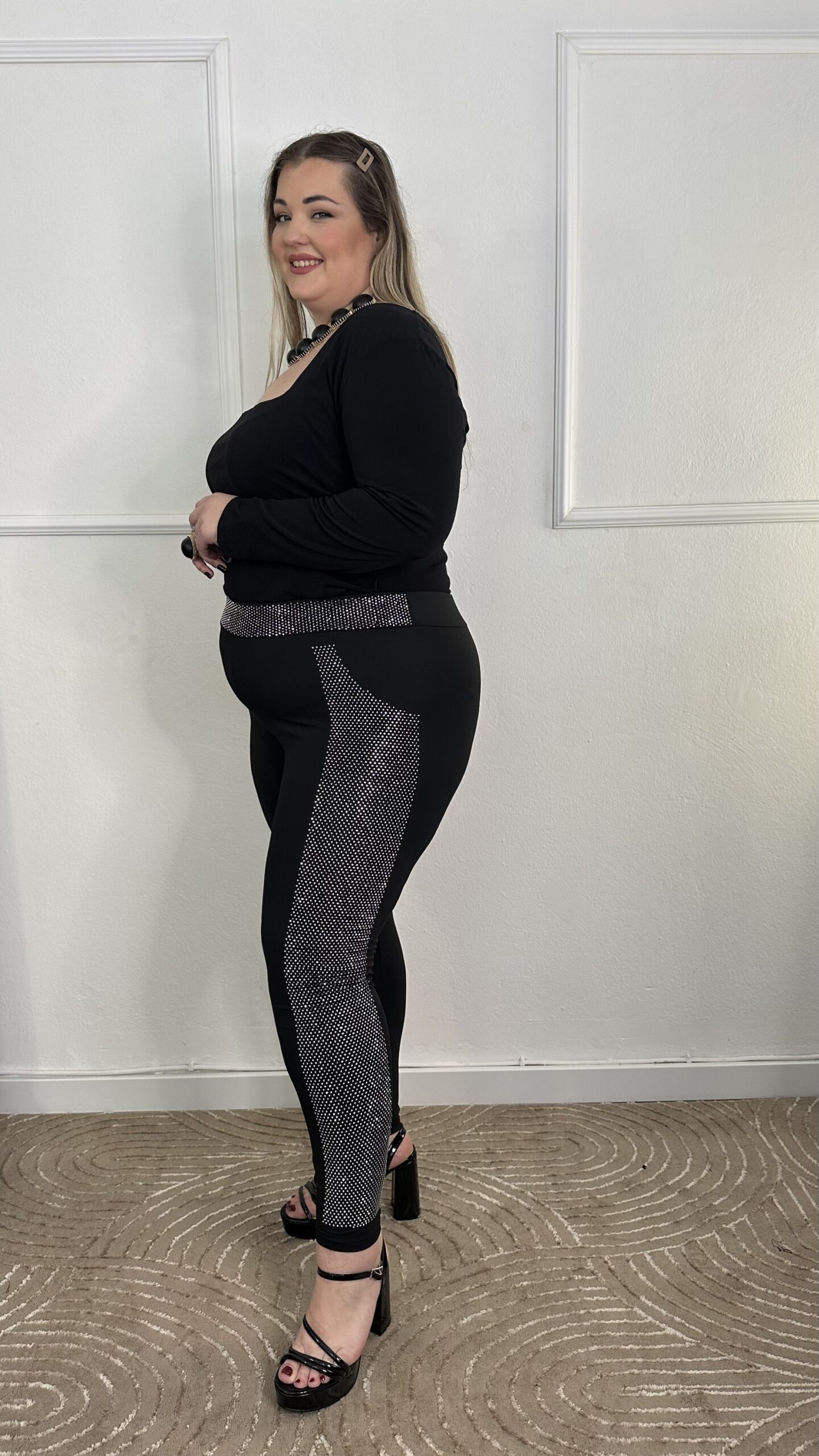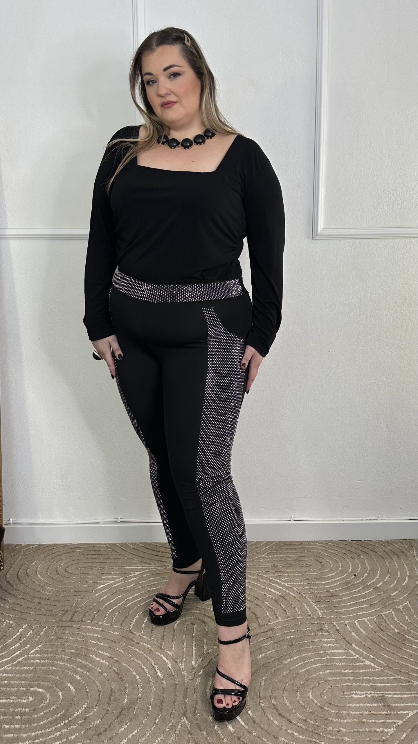 Κατασκευασμένο από ελαστικό ύφασμα υψηλής ποιότητας, αγκαλιάζει το σώμα και προσφέρει τέλεια εφαρμογή. Οι πλαϊνές ρίγες με λαμπερά στρας προσθέτουν εντυπωσιακό glam στοιχείο, ιδανικό για βραδινές εμφανίσεις ή ιδιαίτερες περιστάσεις.
