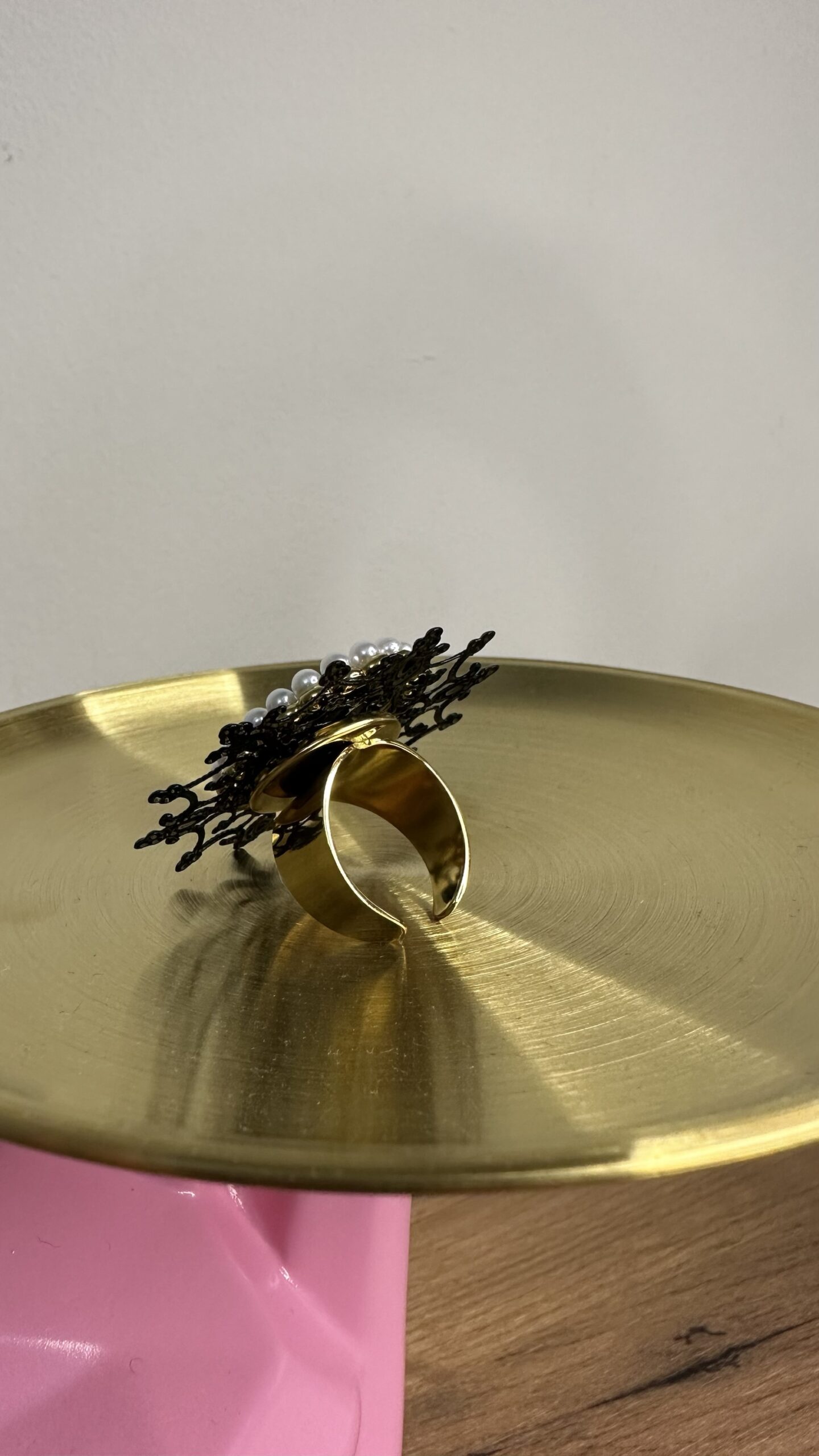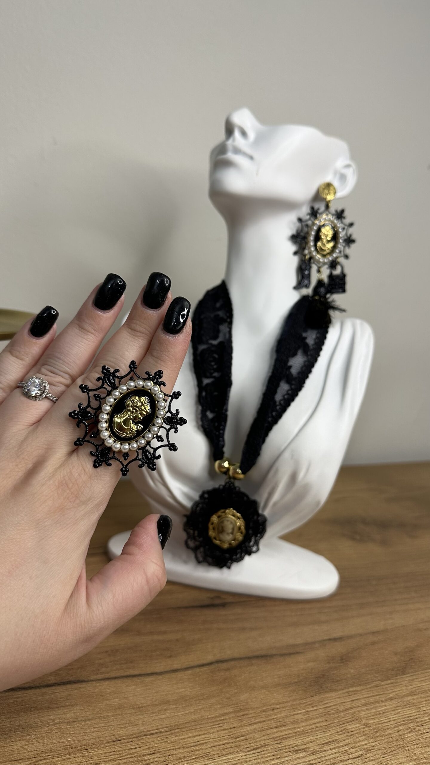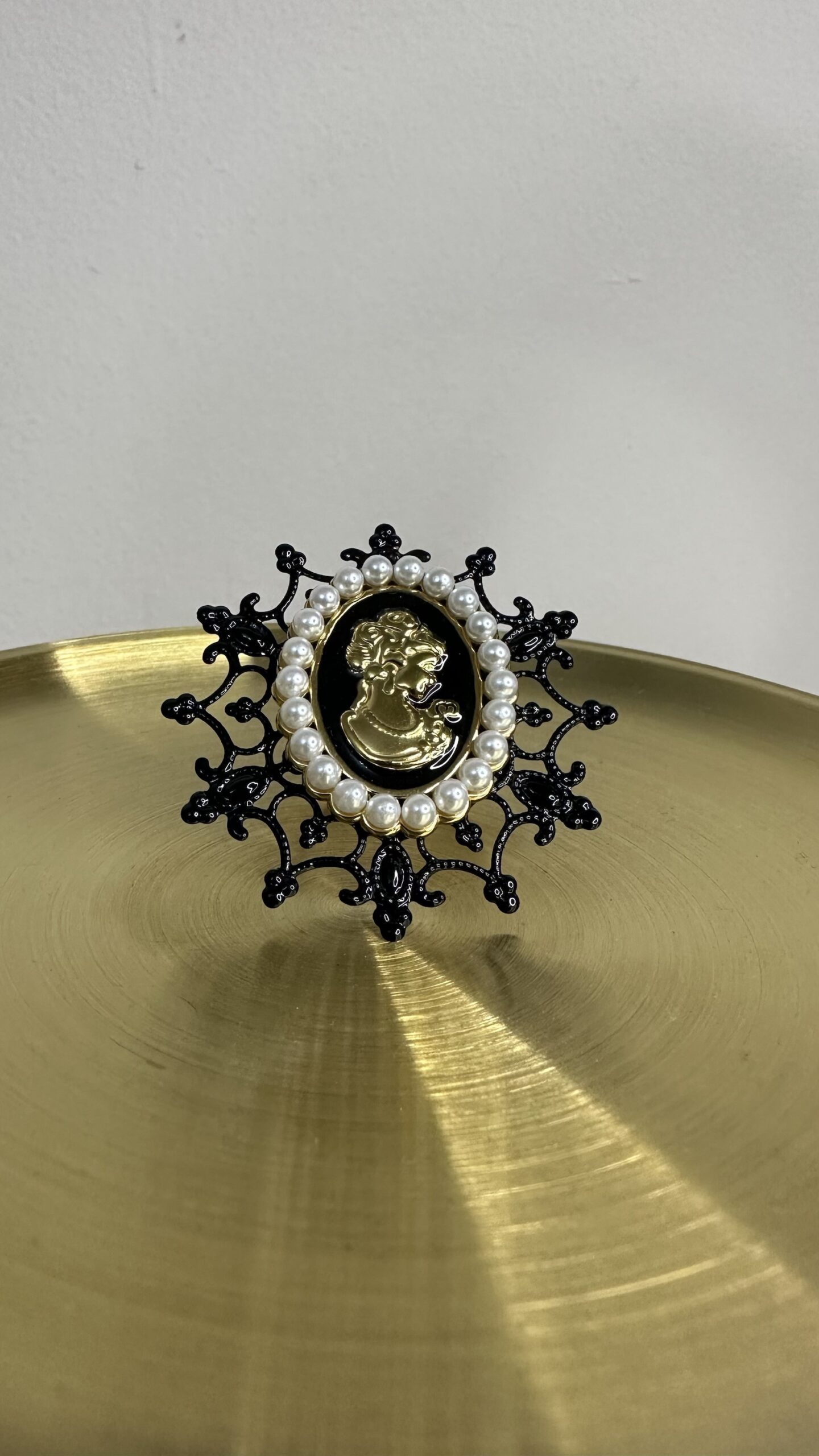 Εντυπωσιακό δαχτυλίδι με κεντρικό ανάγλυφο προφίλ σε χρυσή απόχρωση πάνω σε μαύρη βάση, περιμετρικά διακοσμημένο με λευκές πέρλες. Η περίτεχνη μαύρη μεταλλική δαντέλα που το πλαισιώνει προσδίδει κλασική, μπαρόκ αισθητική, ιδανική για statement εμφανίσεις με vintage χαρακτήρα.